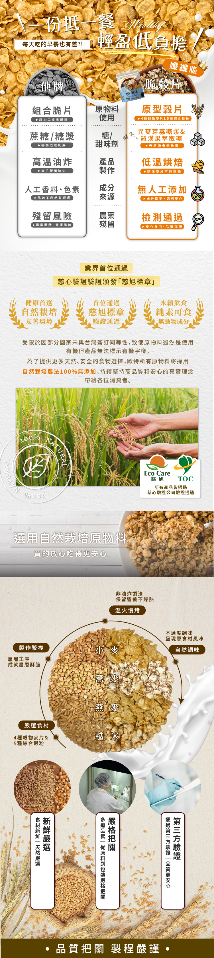 自然栽培大燕麥片(芬蘭)、羅漢果綜合萃取粉(赤藻糖醇、羅漢果醣苷萃取物)(甜味劑)(中國)、自然栽培小麥脆片台灣)、自然栽培低聚異麥芽寡醣漿、自然栽培椰子油、自然栽培糙米、自然栽培椰奶粉(自然栽培椰肉、自然栽培麥芽糊精)、自然栽培抹茶粉、自然栽培五穀粉(自然栽培燕麥、自然栽培紅扁豆、自然栽培珍珠大麥、自然栽培小米、自然栽培黑豆)、自然栽培蕎麥、自然栽培糙米脆粒